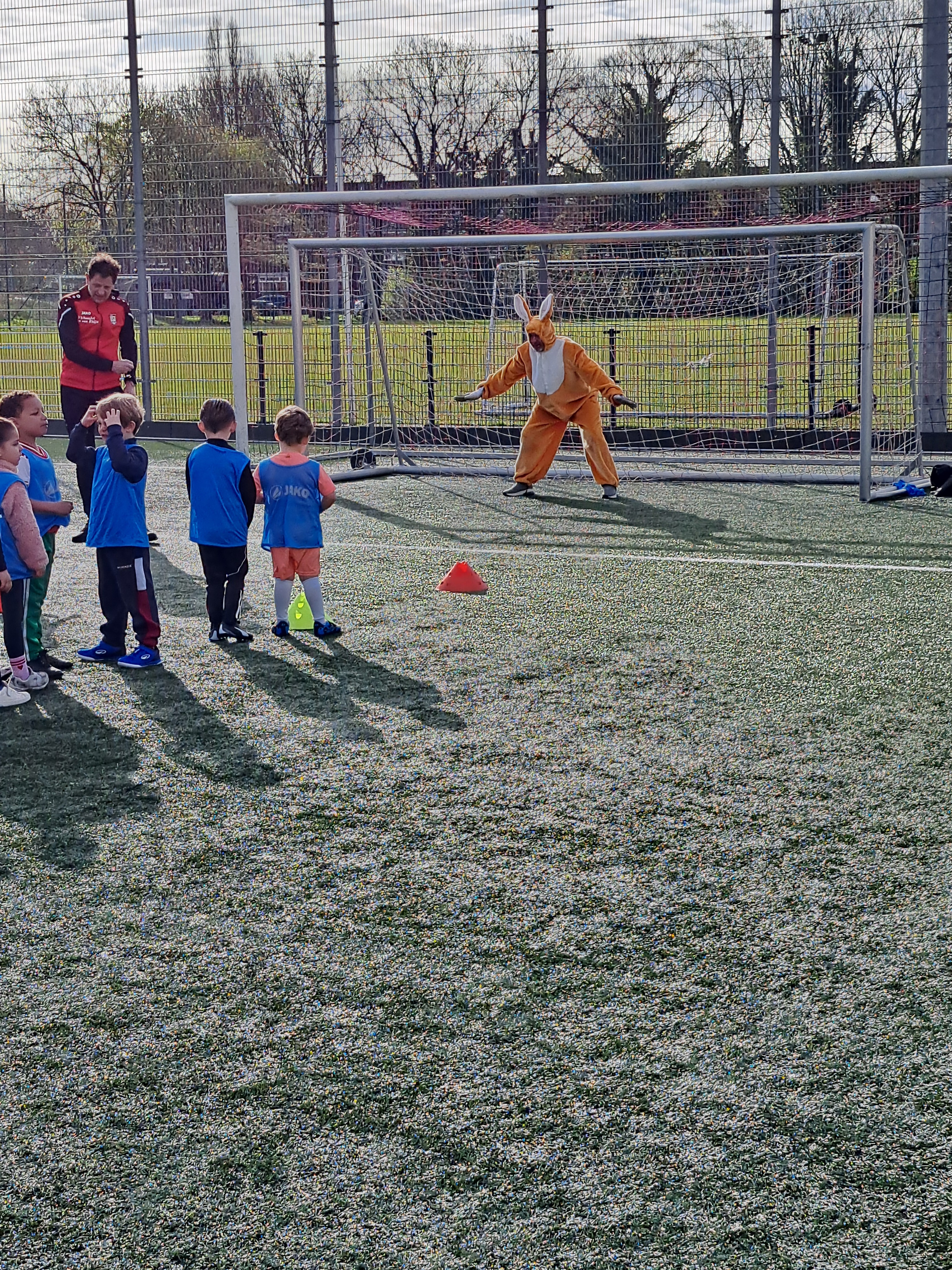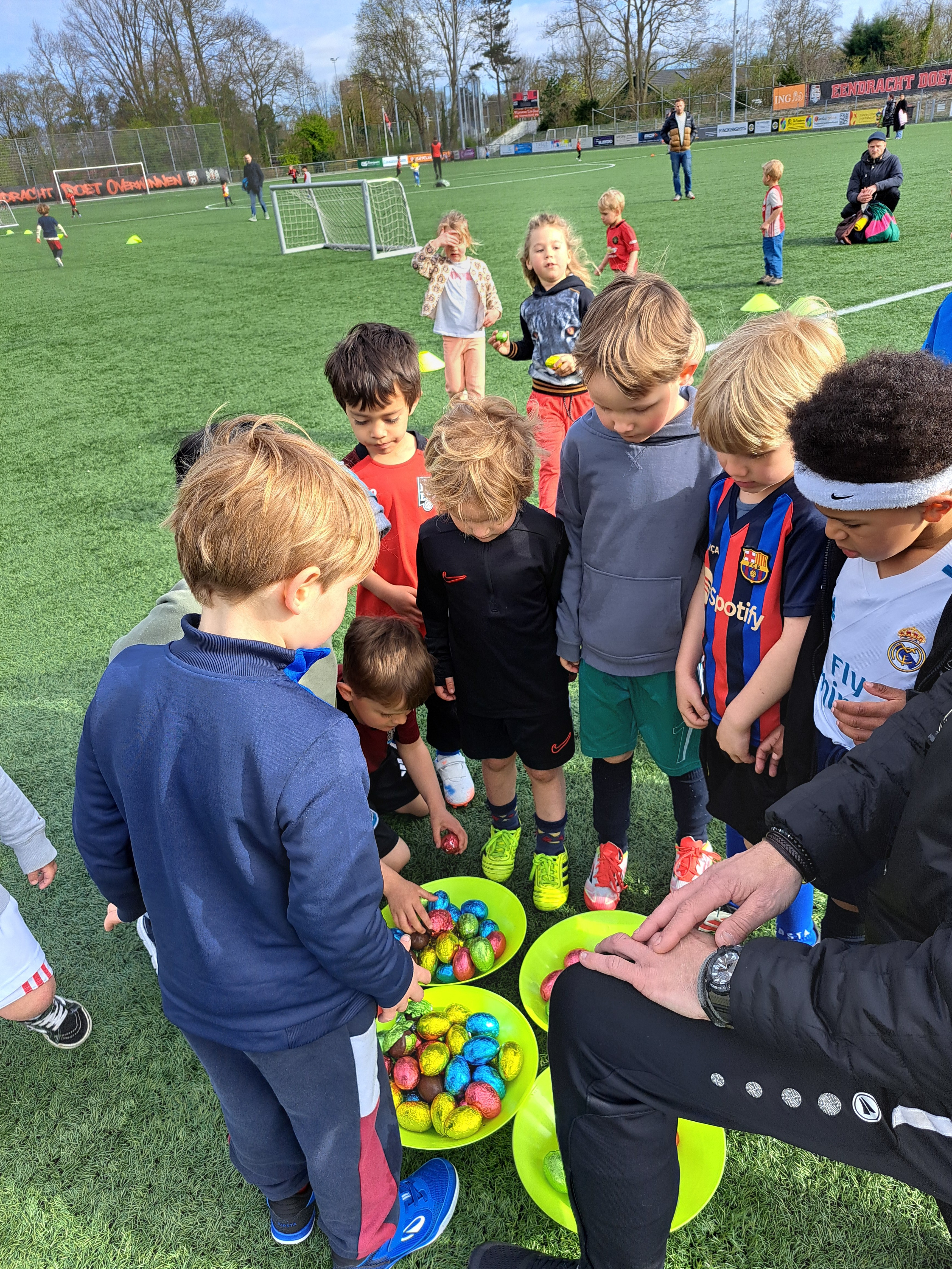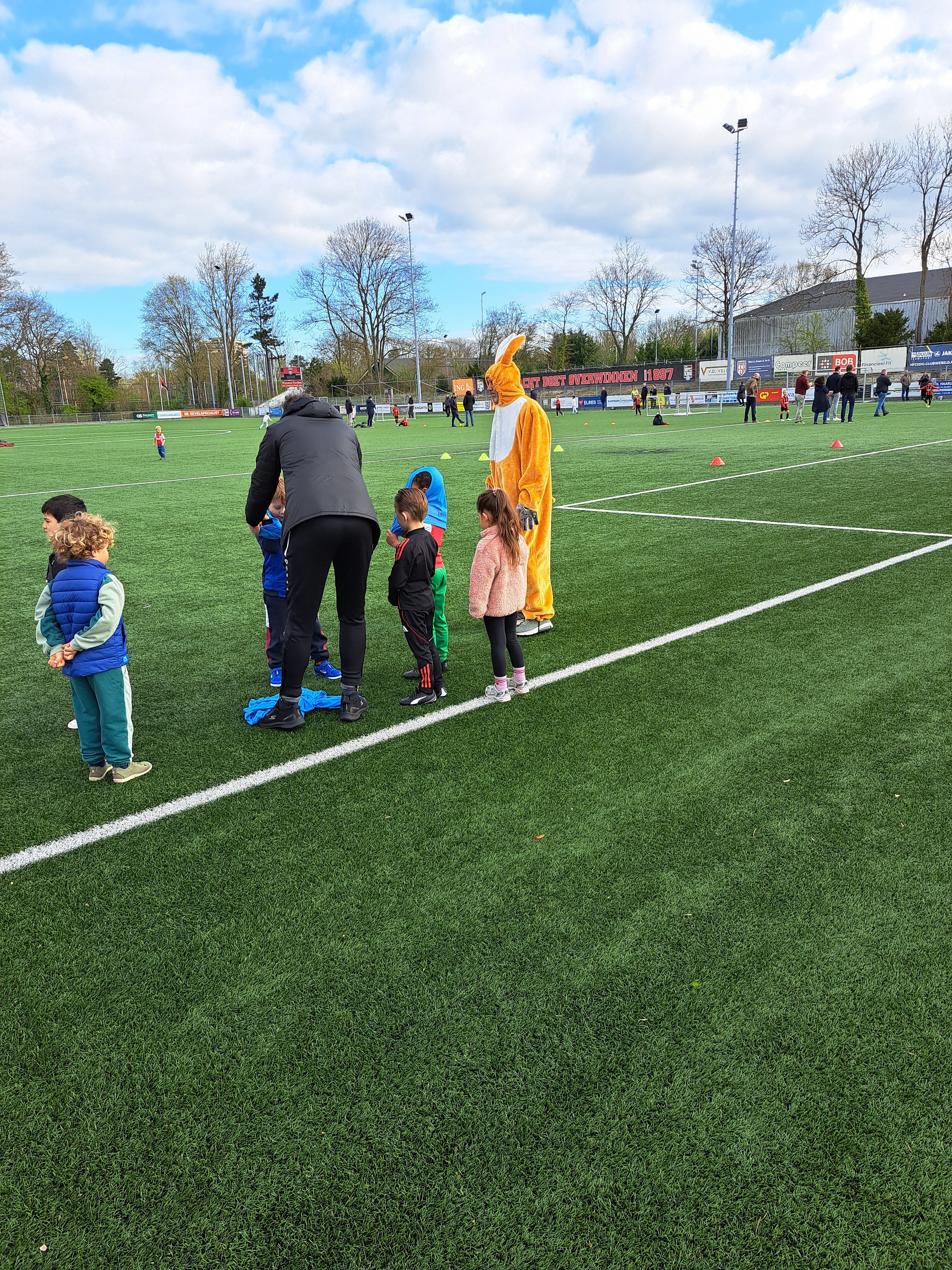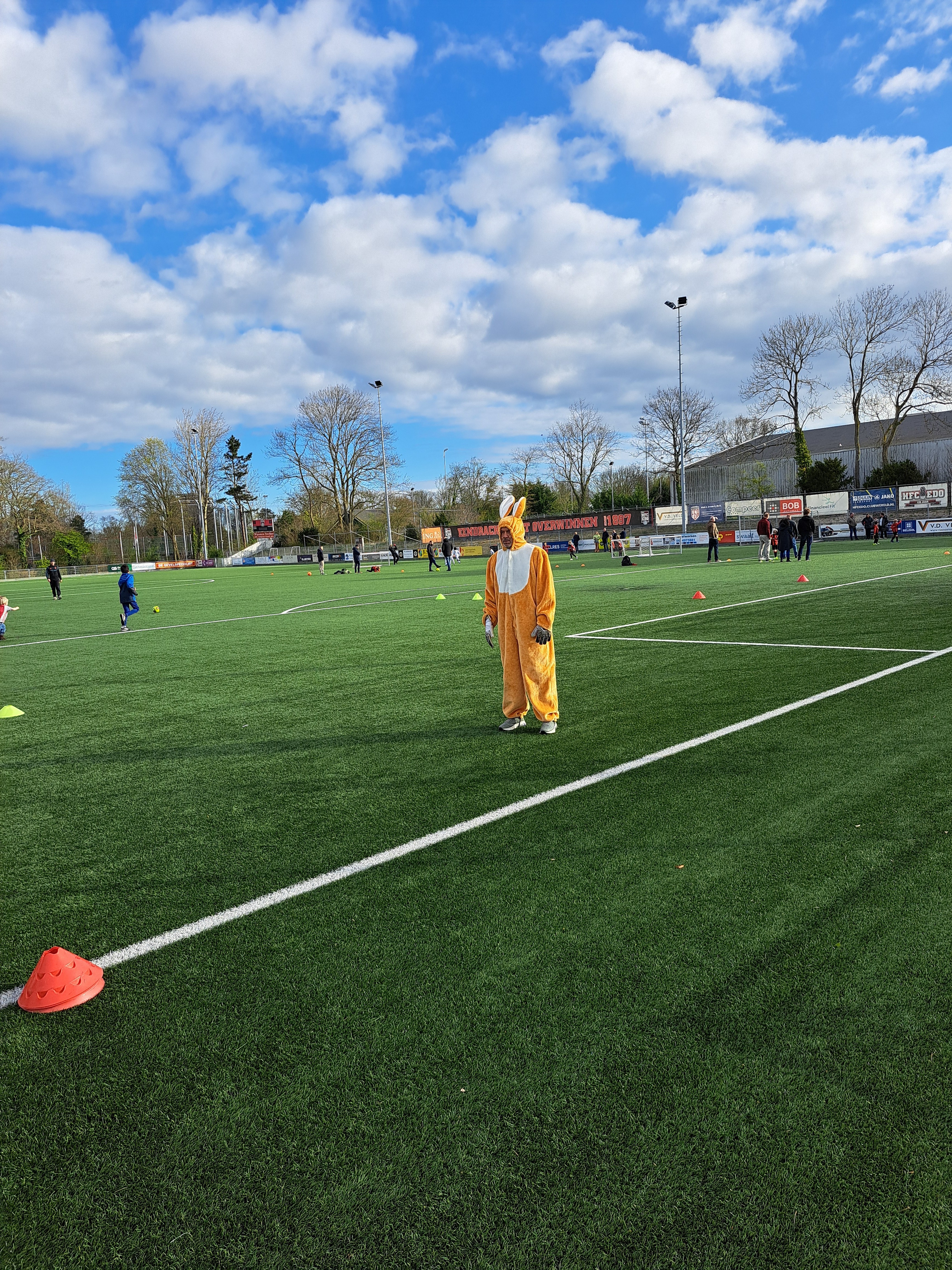 Zo stond niet een trainer of medespelertje op goal maar de Paashaas in hoogst eigen persoon en konden alle voetballertjes in de leeftijd van 4 tot -7 na de training paaseieren zoeken.