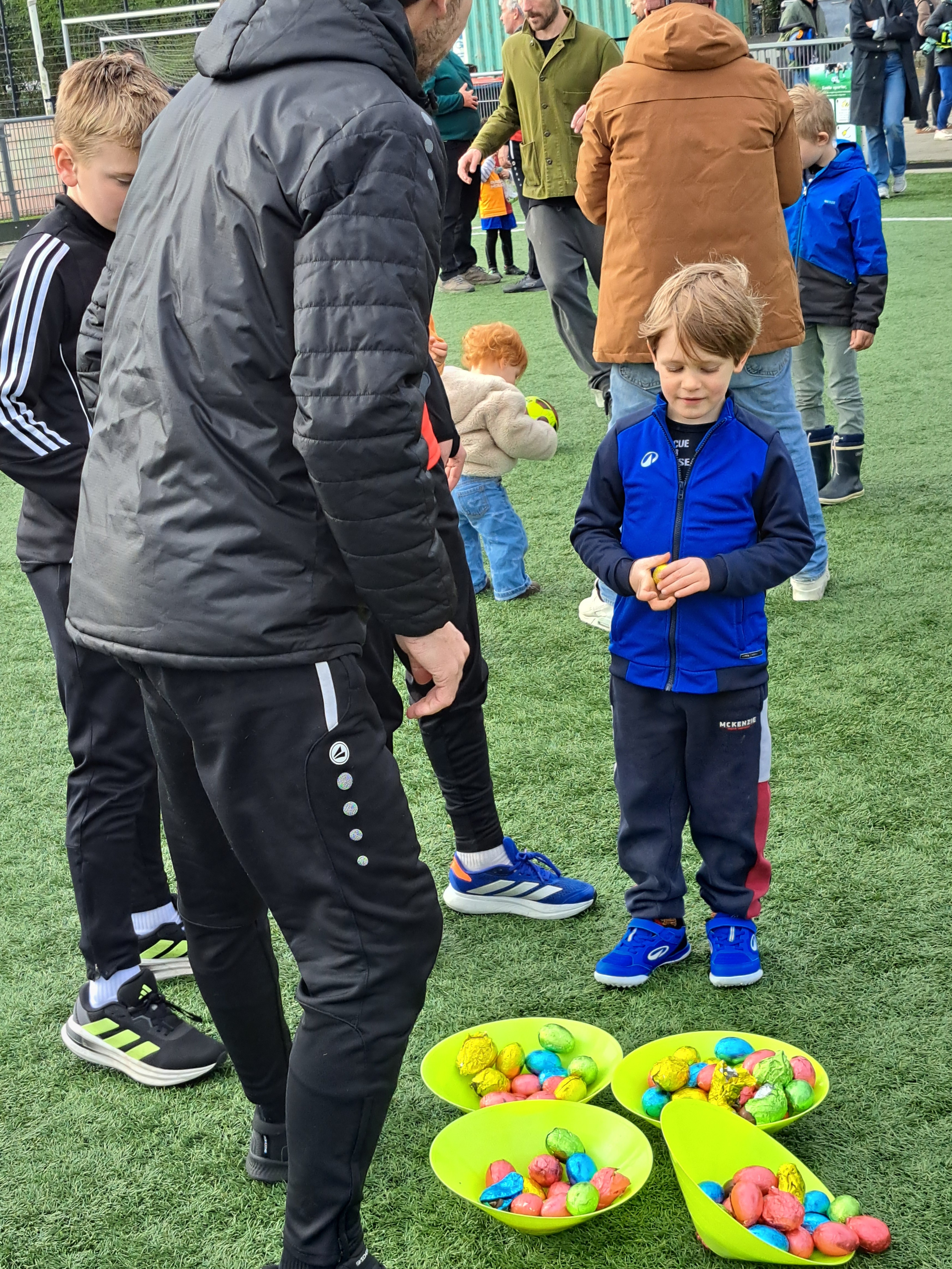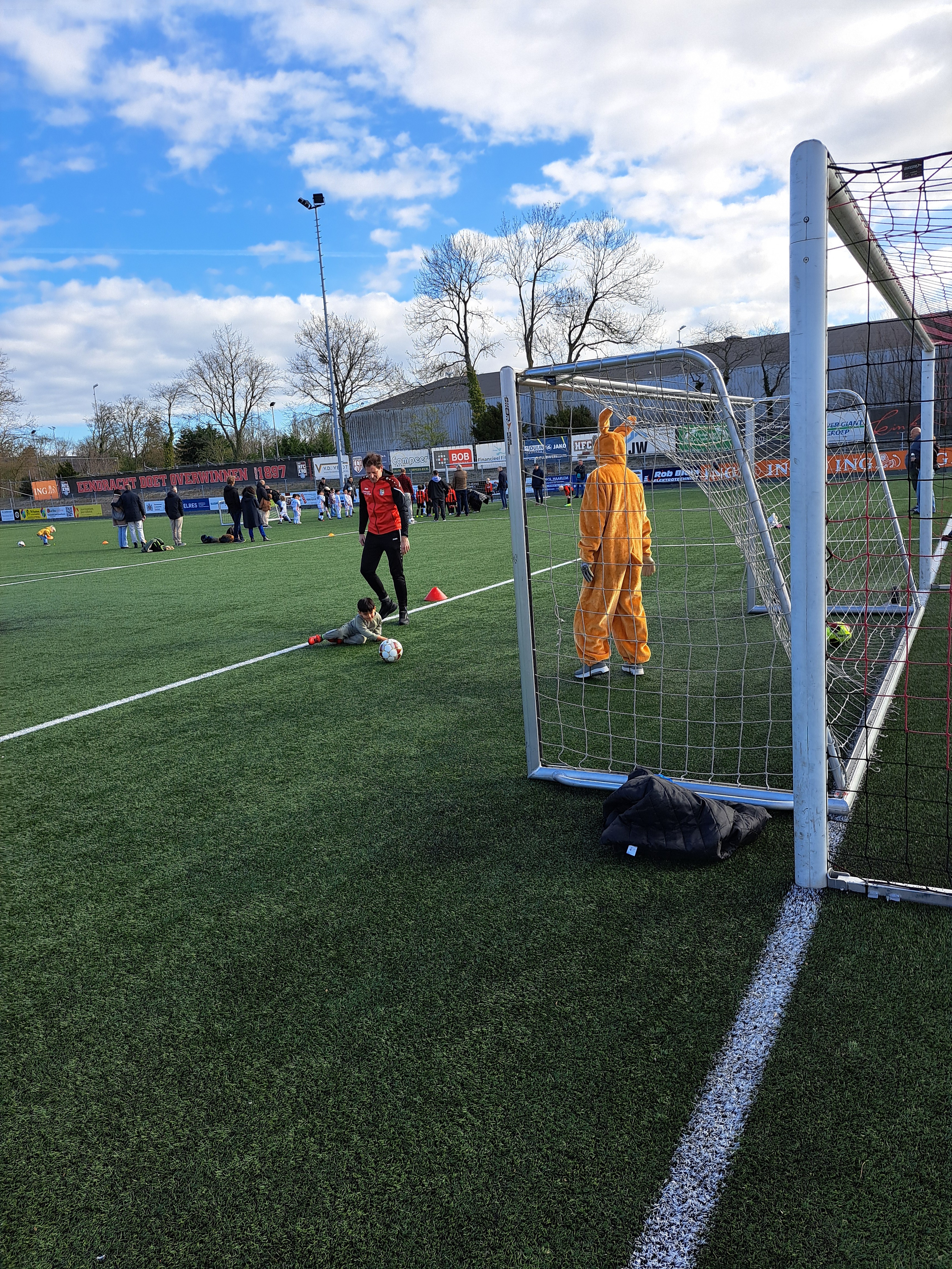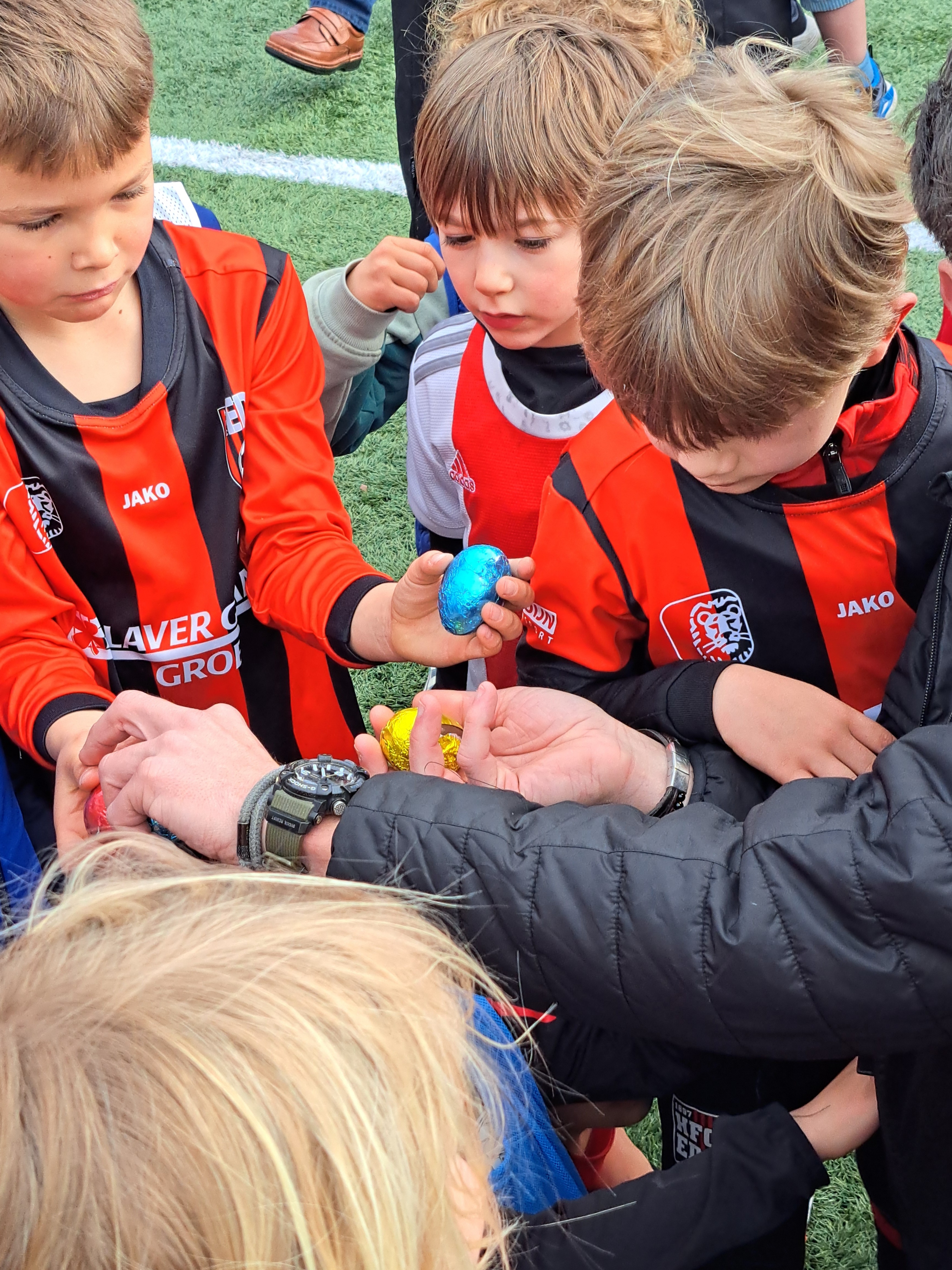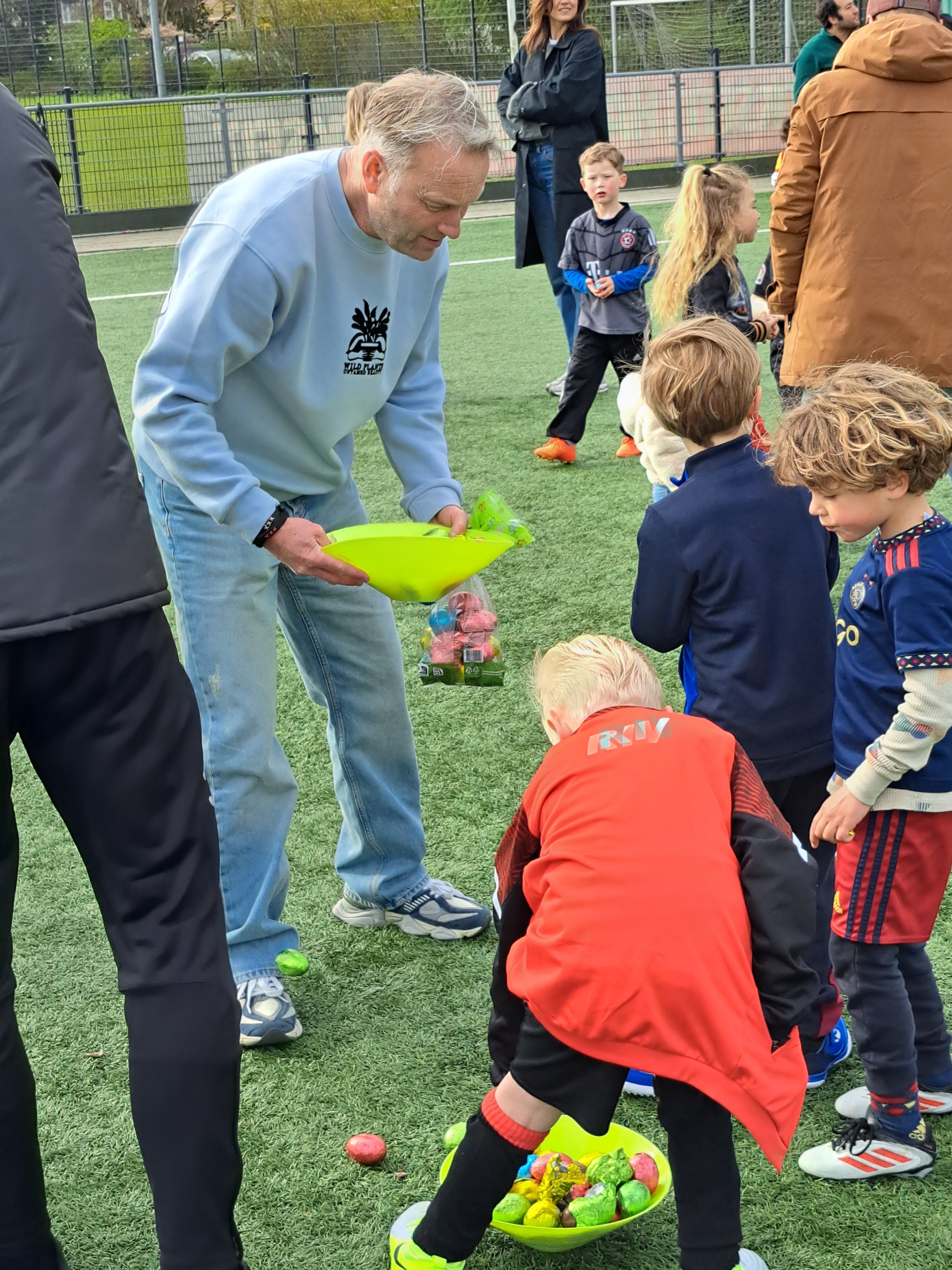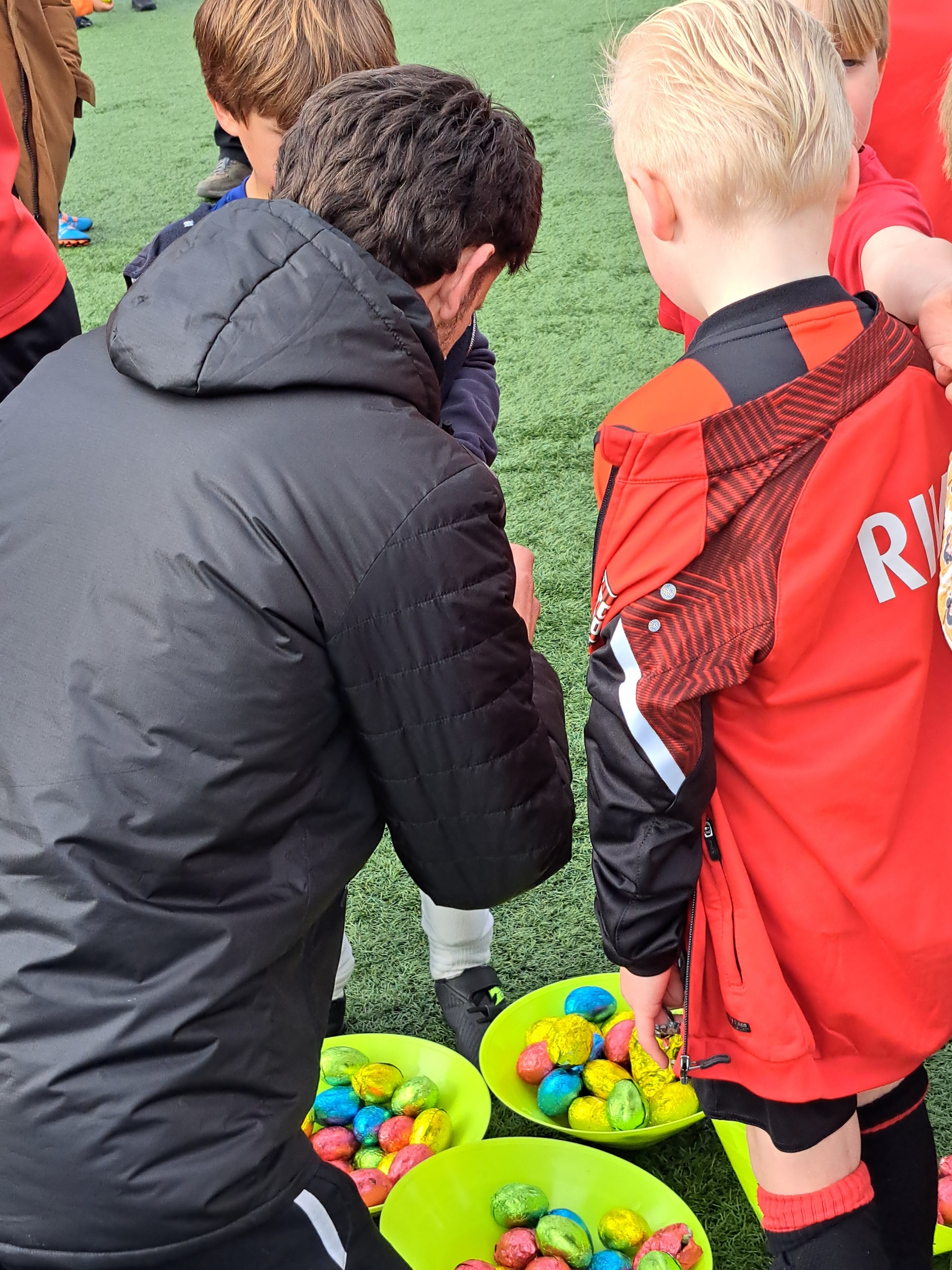 Zo stond niet een trainer of medespelertje op goal maar de Paashaas in hoogst eigen persoon en konden alle voetballertjes in de leeftijd van 4 tot -7 na de training paaseieren zoeken.