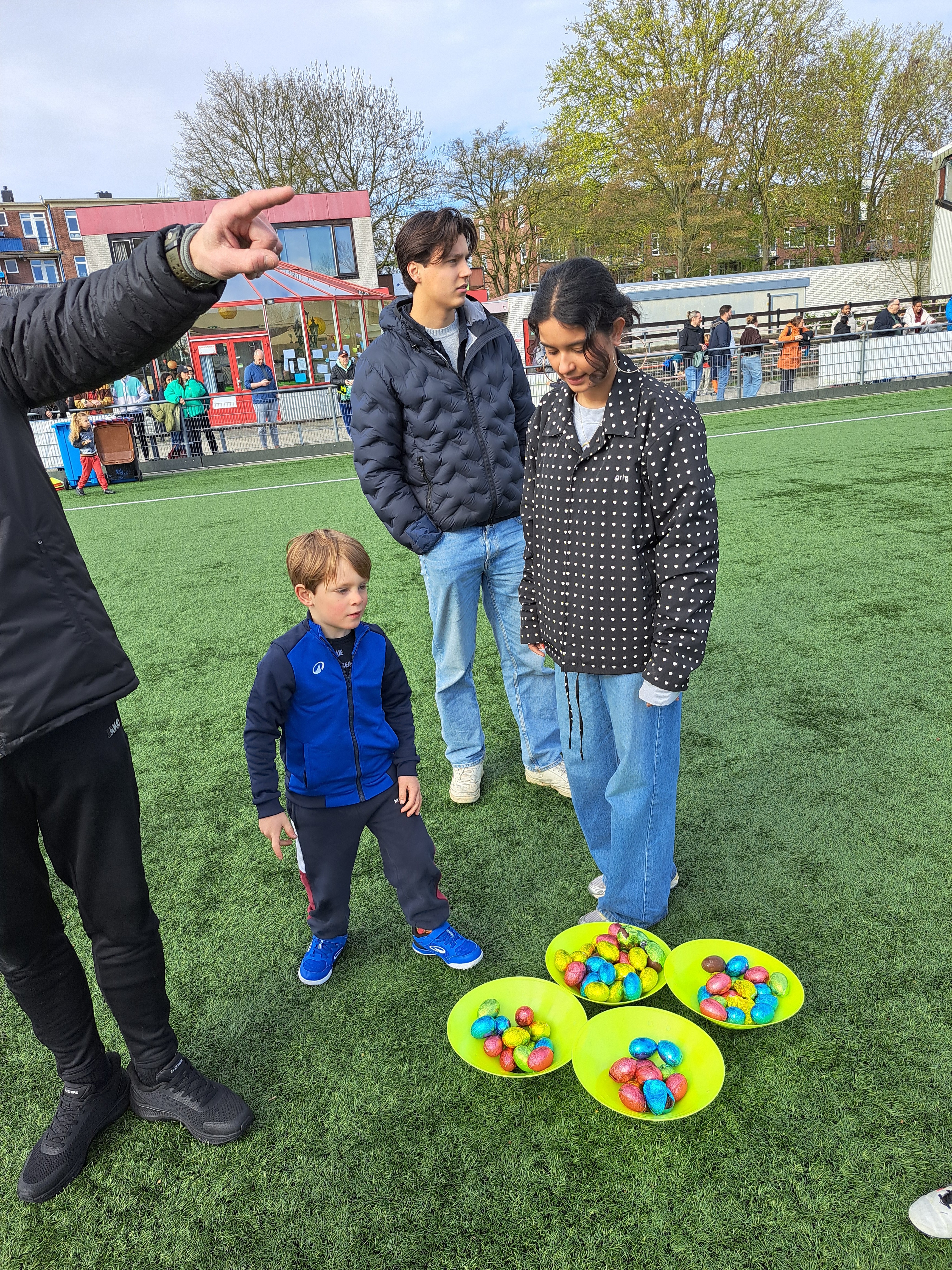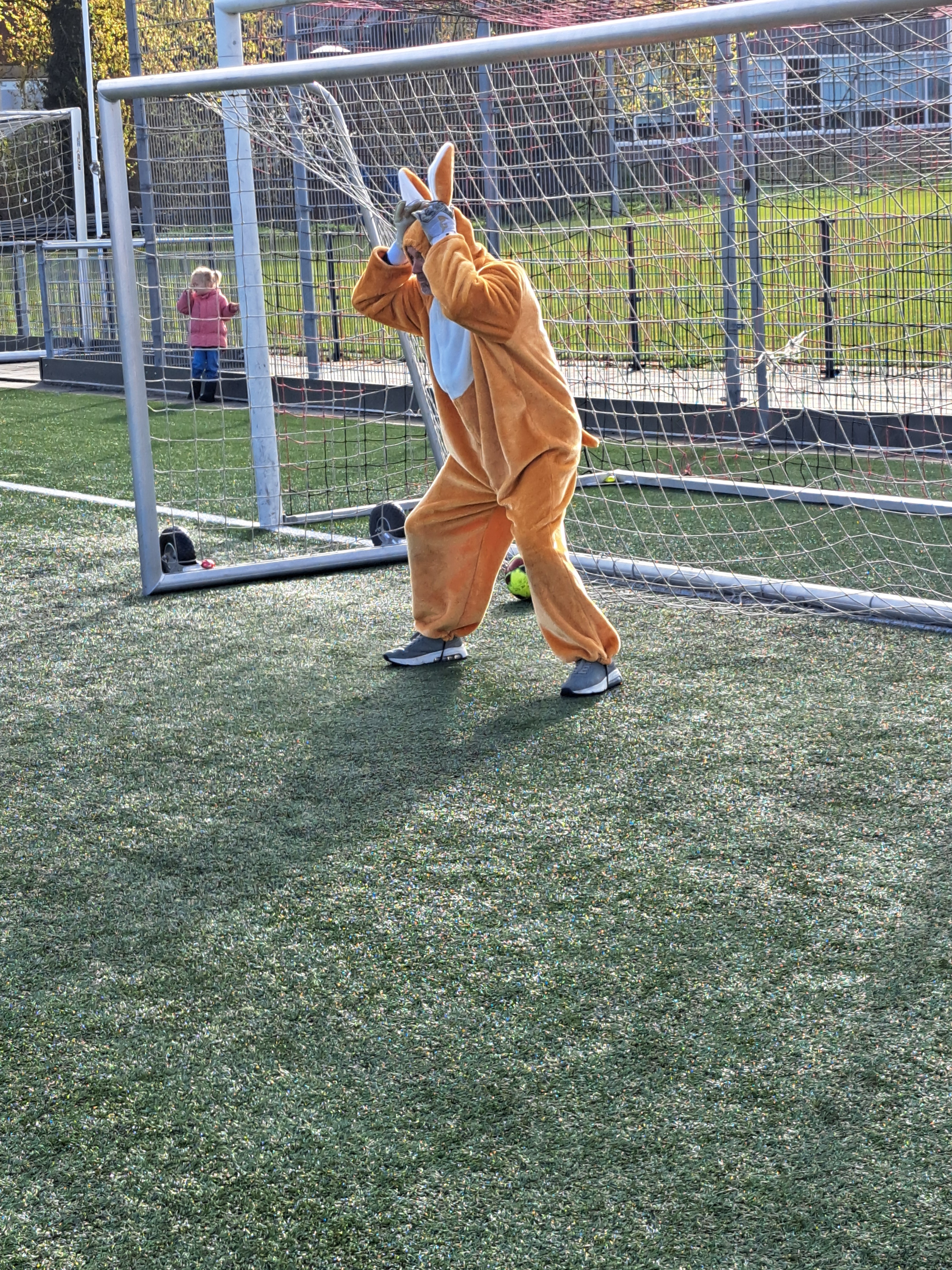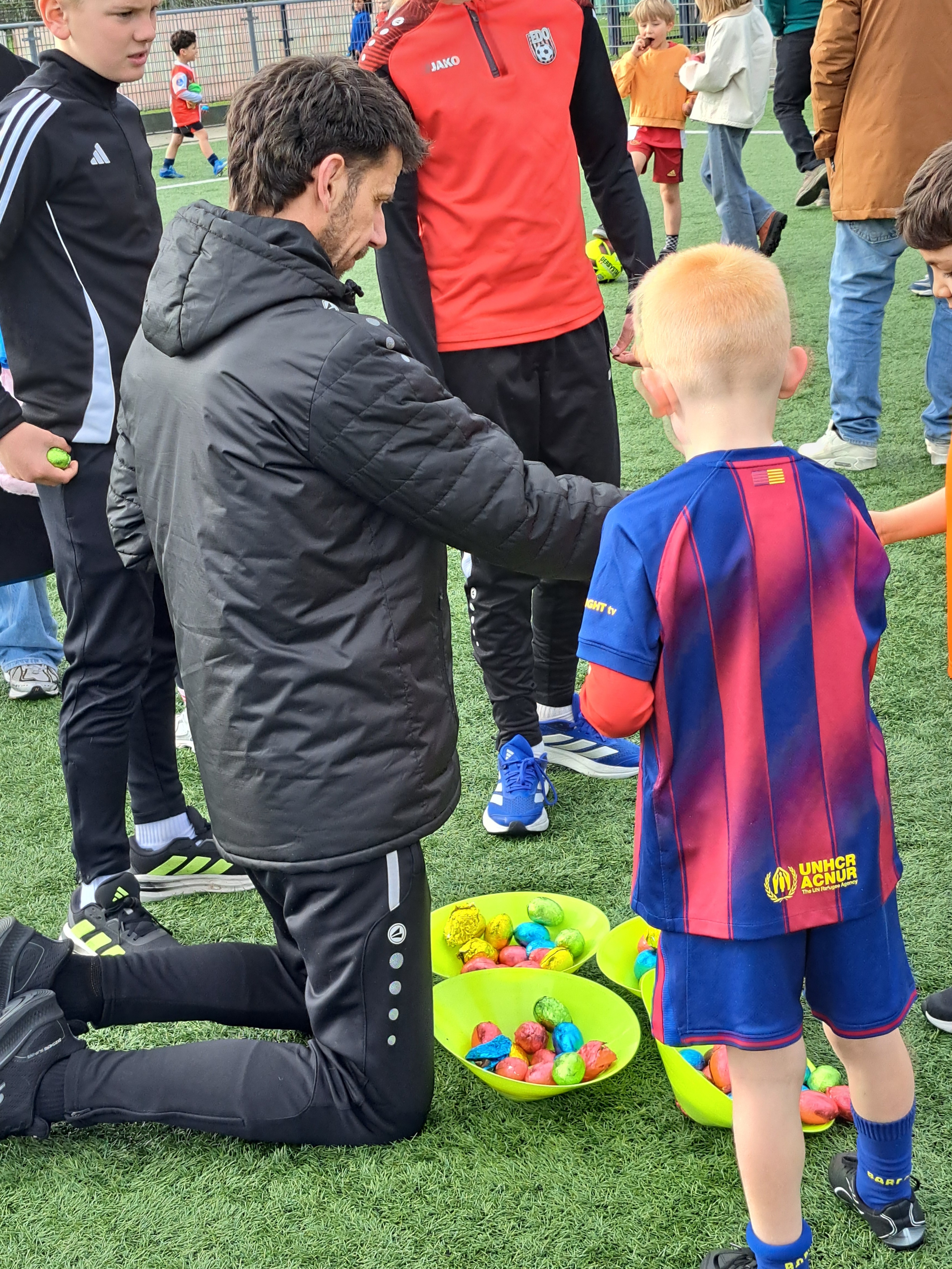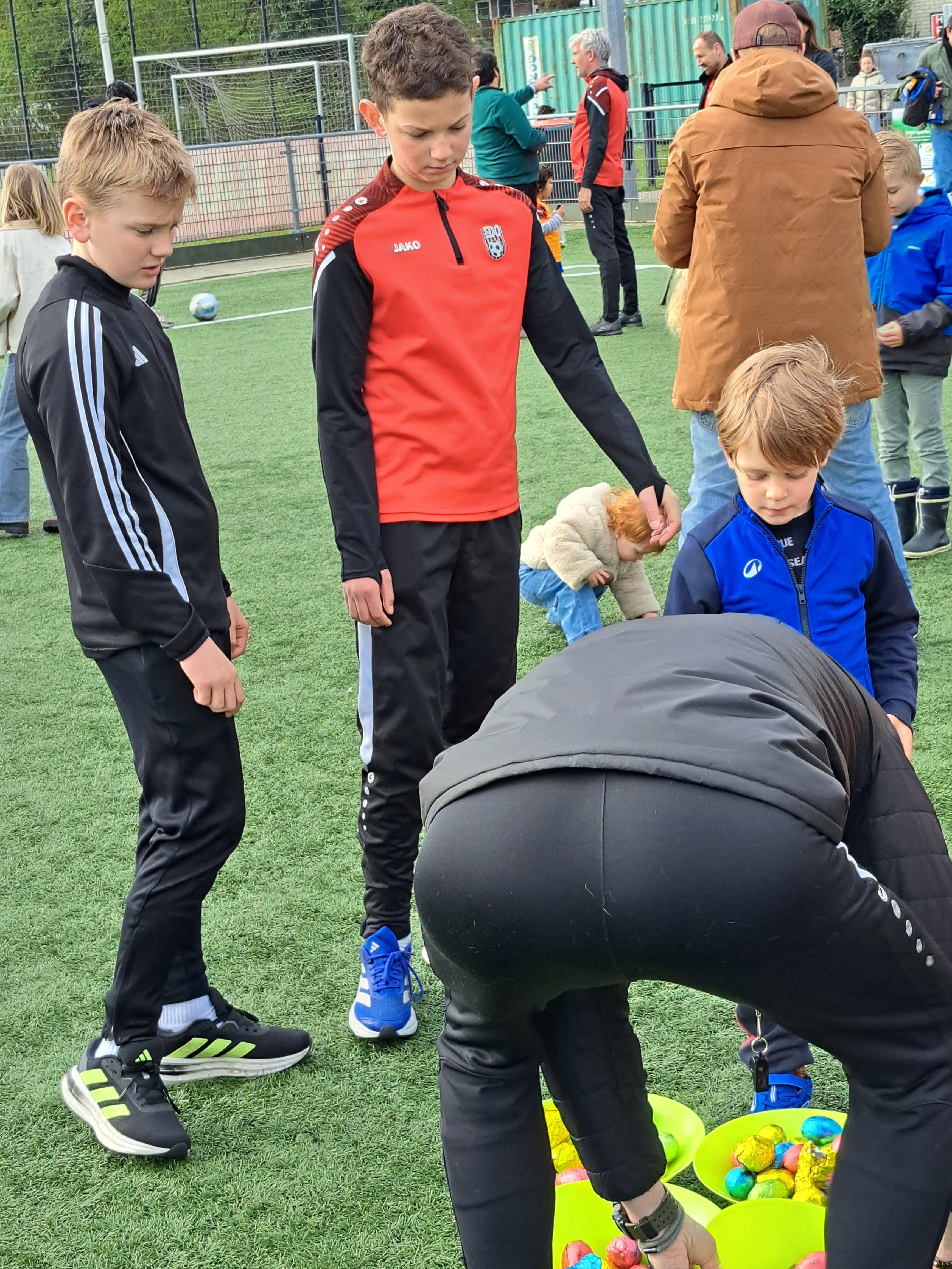 Zo stond niet een trainer of medespelertje op goal maar de Paashaas in hoogst eigen persoon en konden alle voetballertjes in de leeftijd van 4 tot -7 na de training paaseieren zoeken.