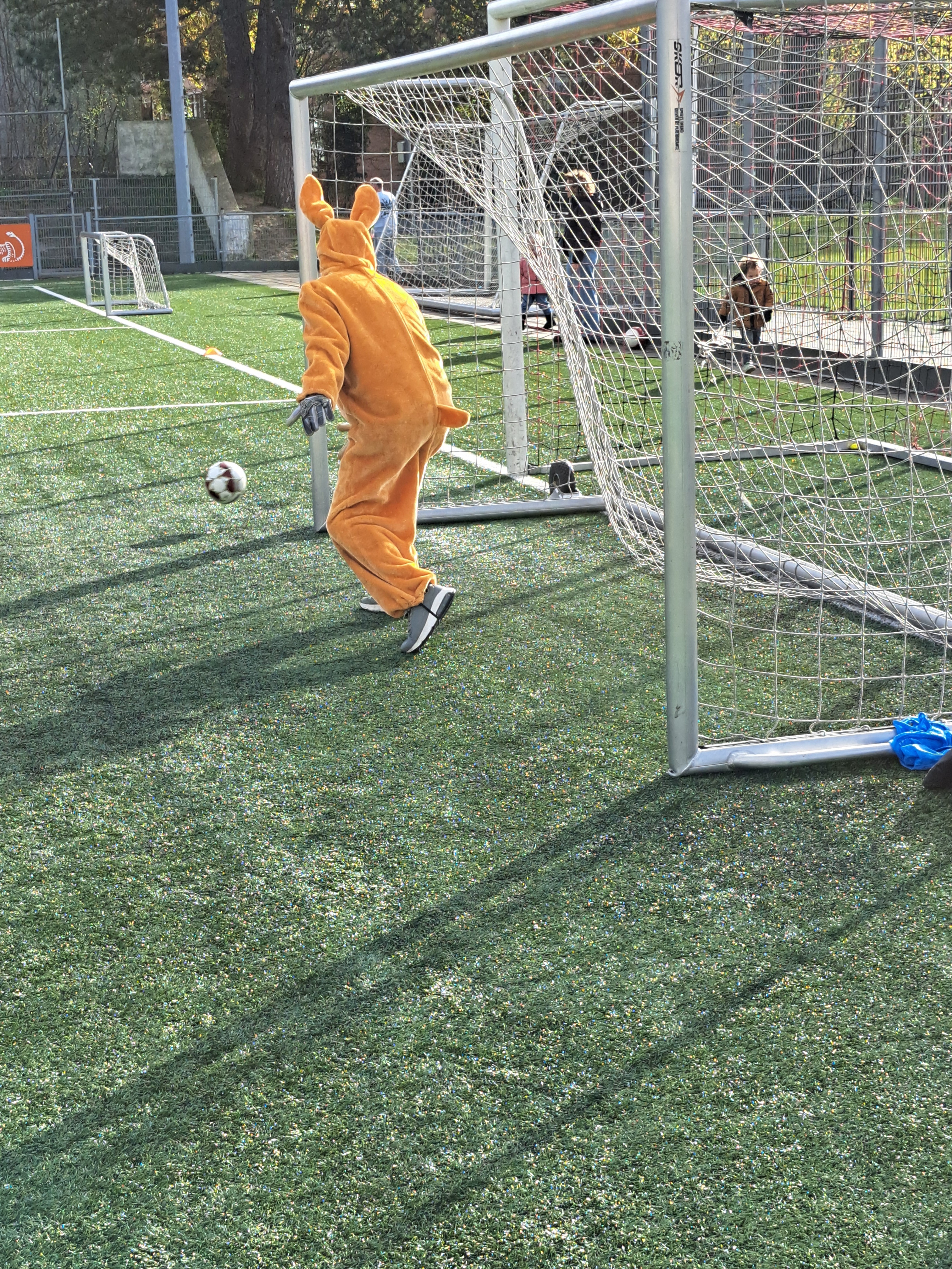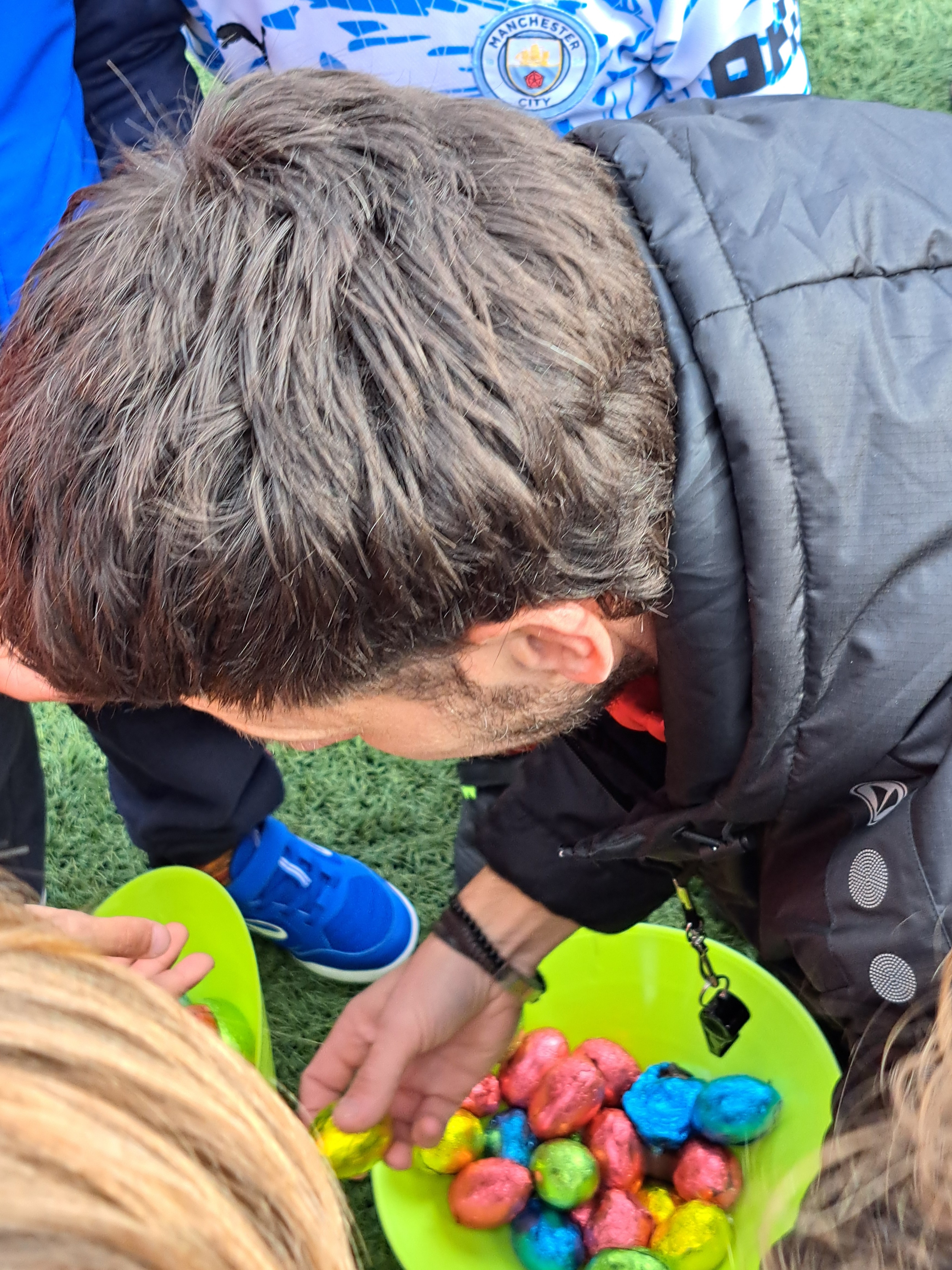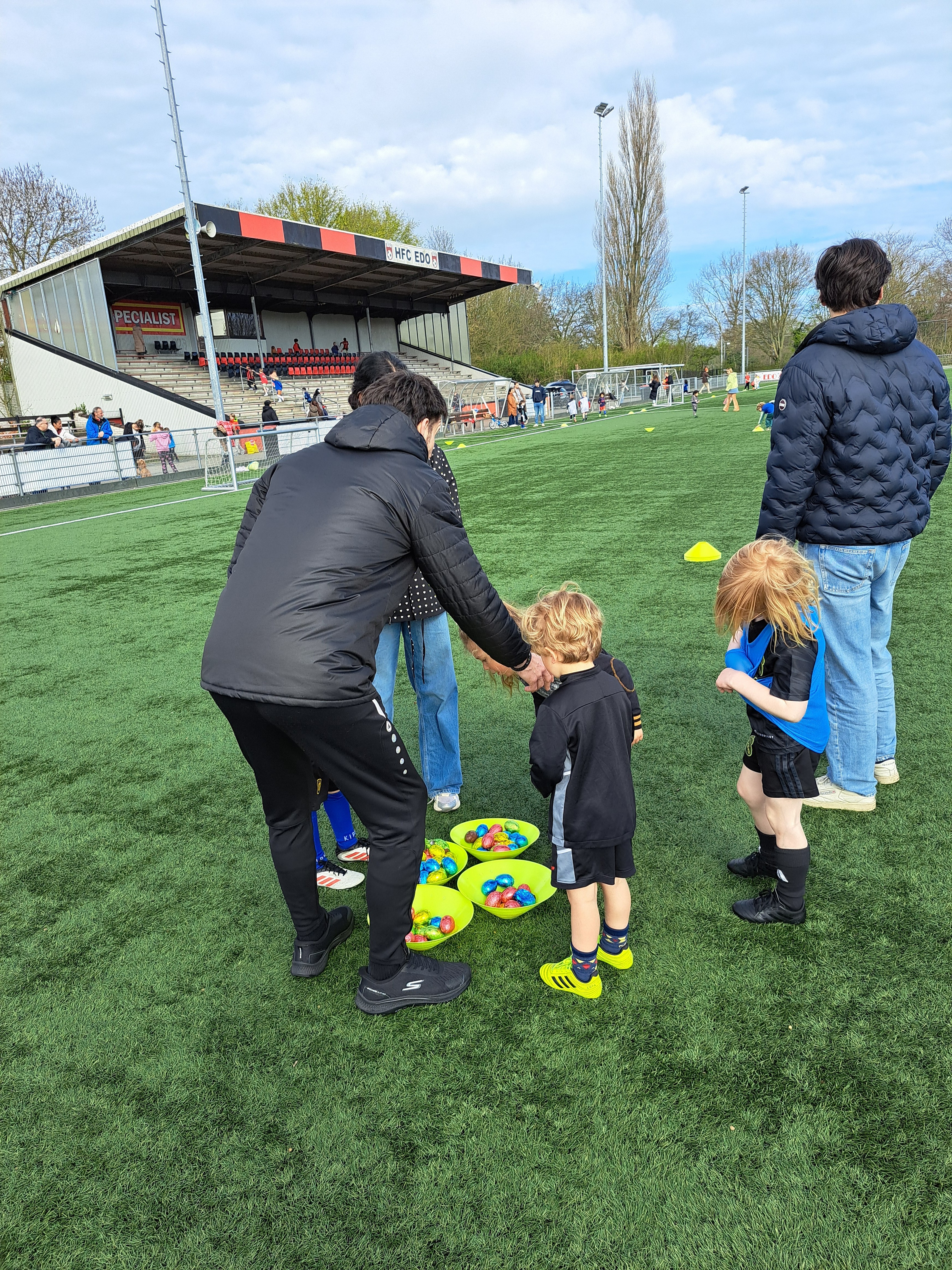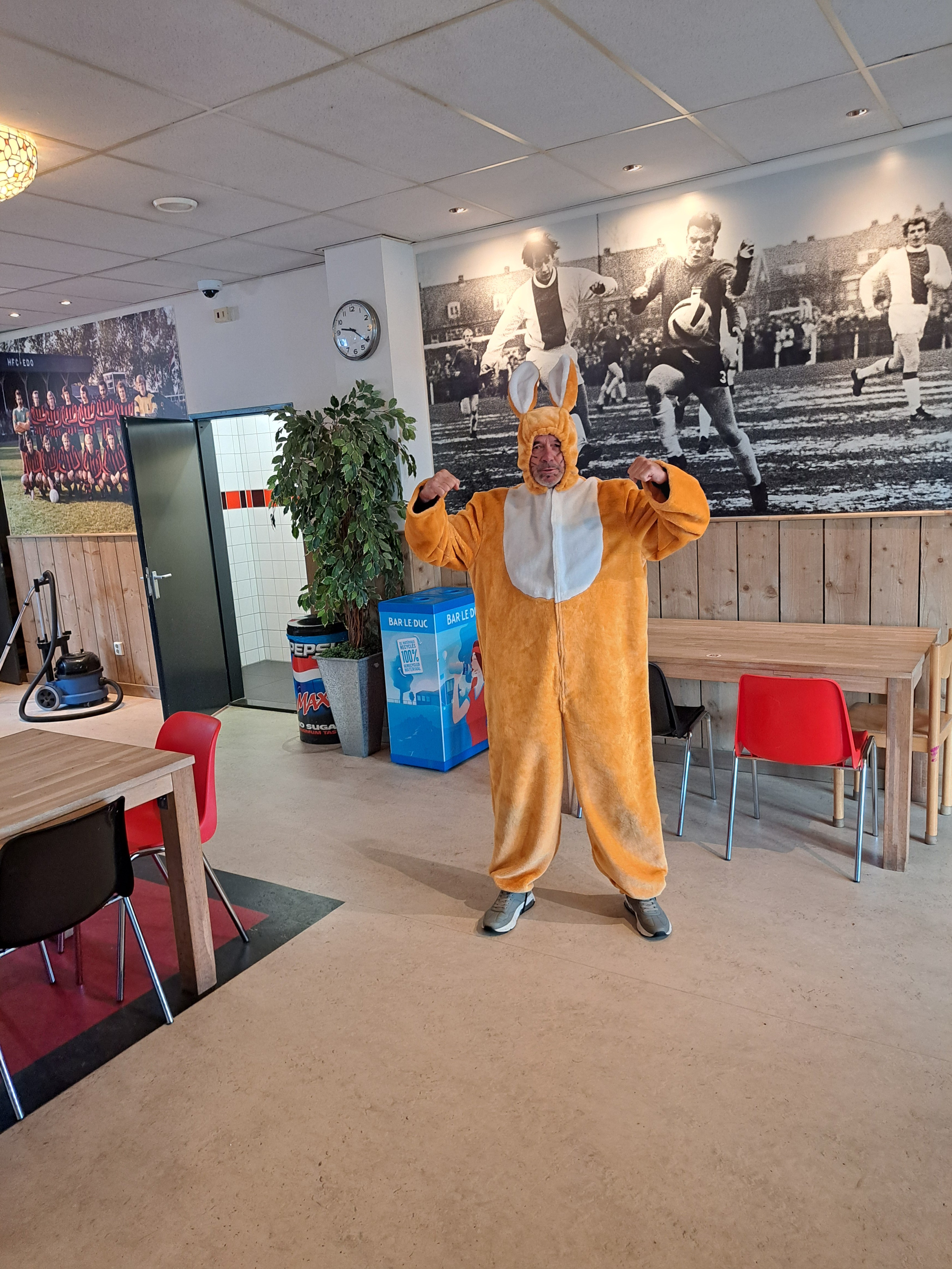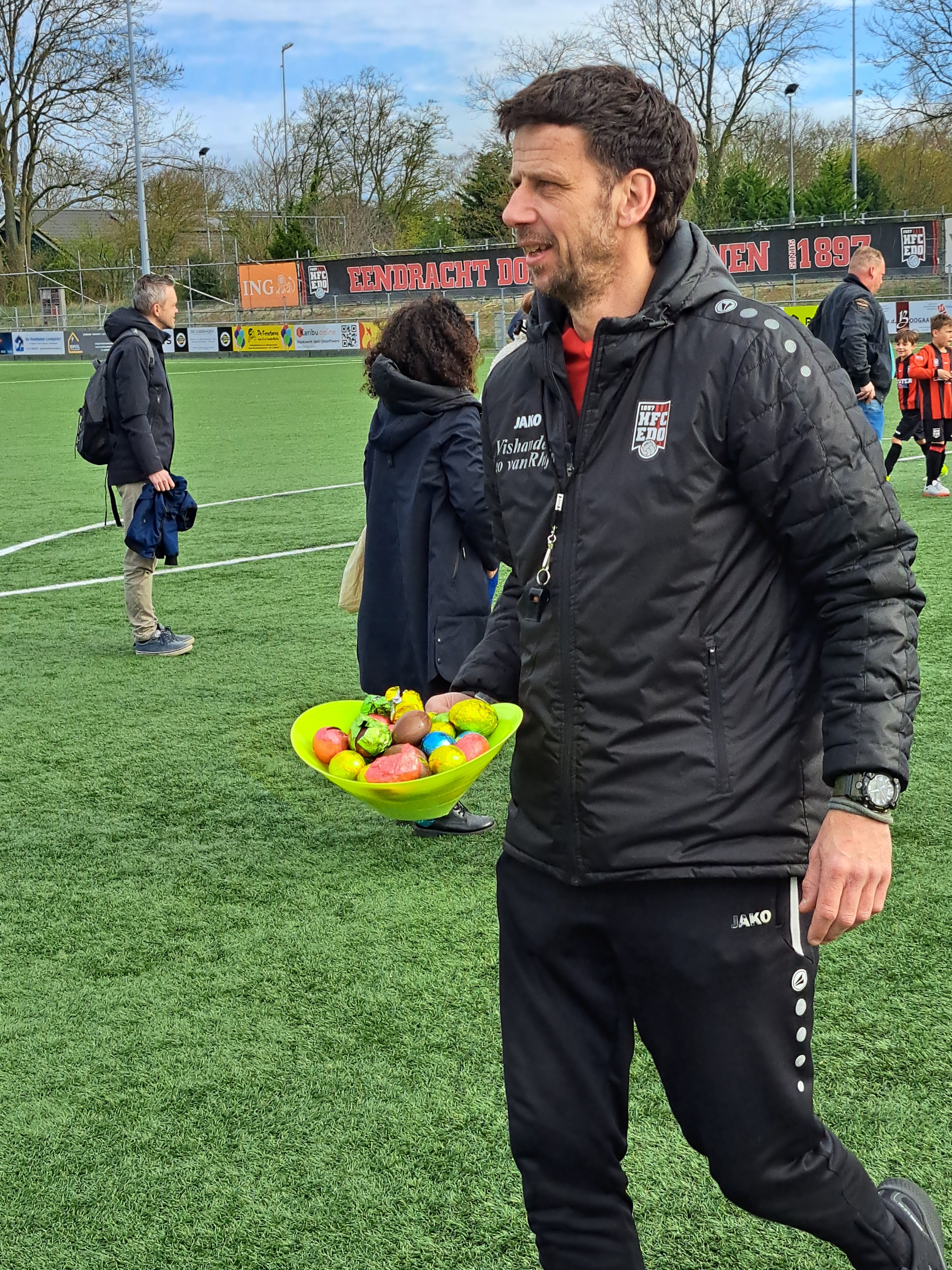 Zo stond niet een trainer of medespelertje op goal maar de Paashaas in hoogst eigen persoon en konden alle voetballertjes in de leeftijd van 4 tot -7 na de training paaseieren zoeken.
