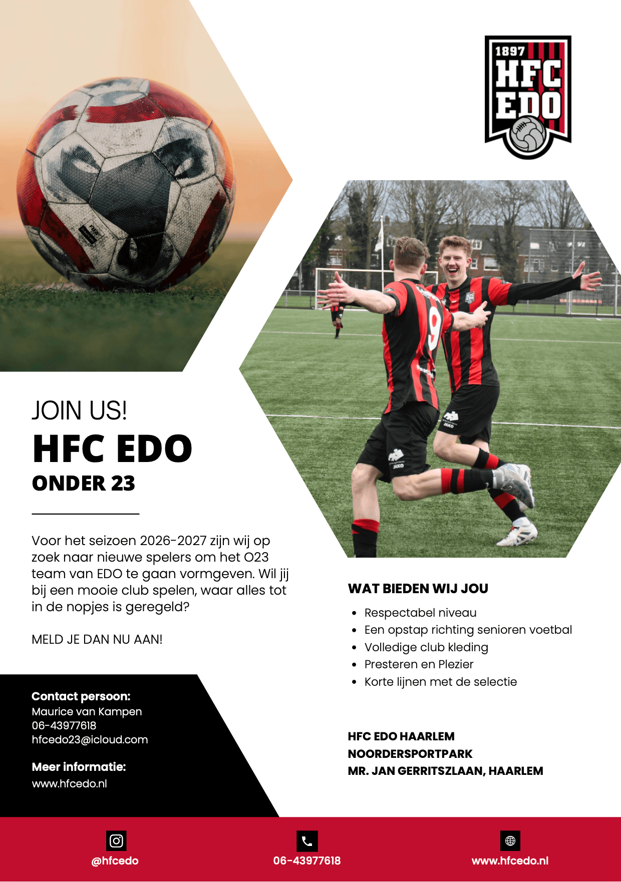 Voor het seizoen 2026-2027 zijn wij op zoek naar nieuwe spelers om het onder-23 team van HFC EDO te gaan vormgeven.