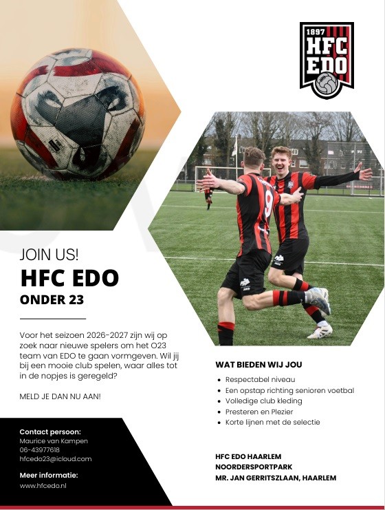 Voor het seizoen 2026-2027 zijn wij op zoek naar nieuwe spelers om het onder-23 team van HFC EDO te gaan vormgeven.