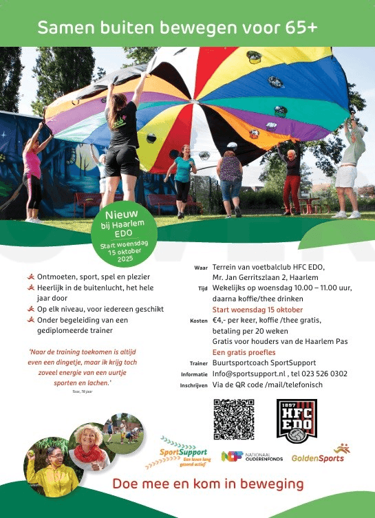 Vanaf woensdag 15 oktober 2025 is HFC EDO gestart met een nieuwe Samen bewegen groep voor 65 plussers uit Haarlem-Noord. Woont U daarbuiten bent U natuurlijk ook van harte welkom !!