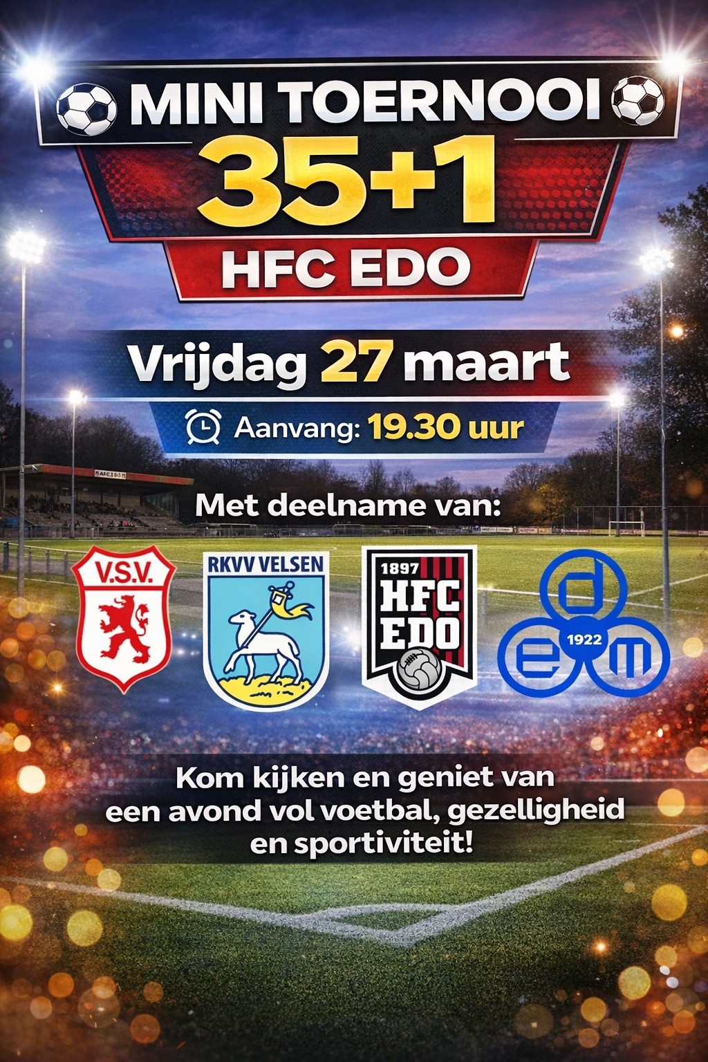 Vrijdagavond 27 maart: minitoernooi 35+ voetbal op het complex van HFC EDO